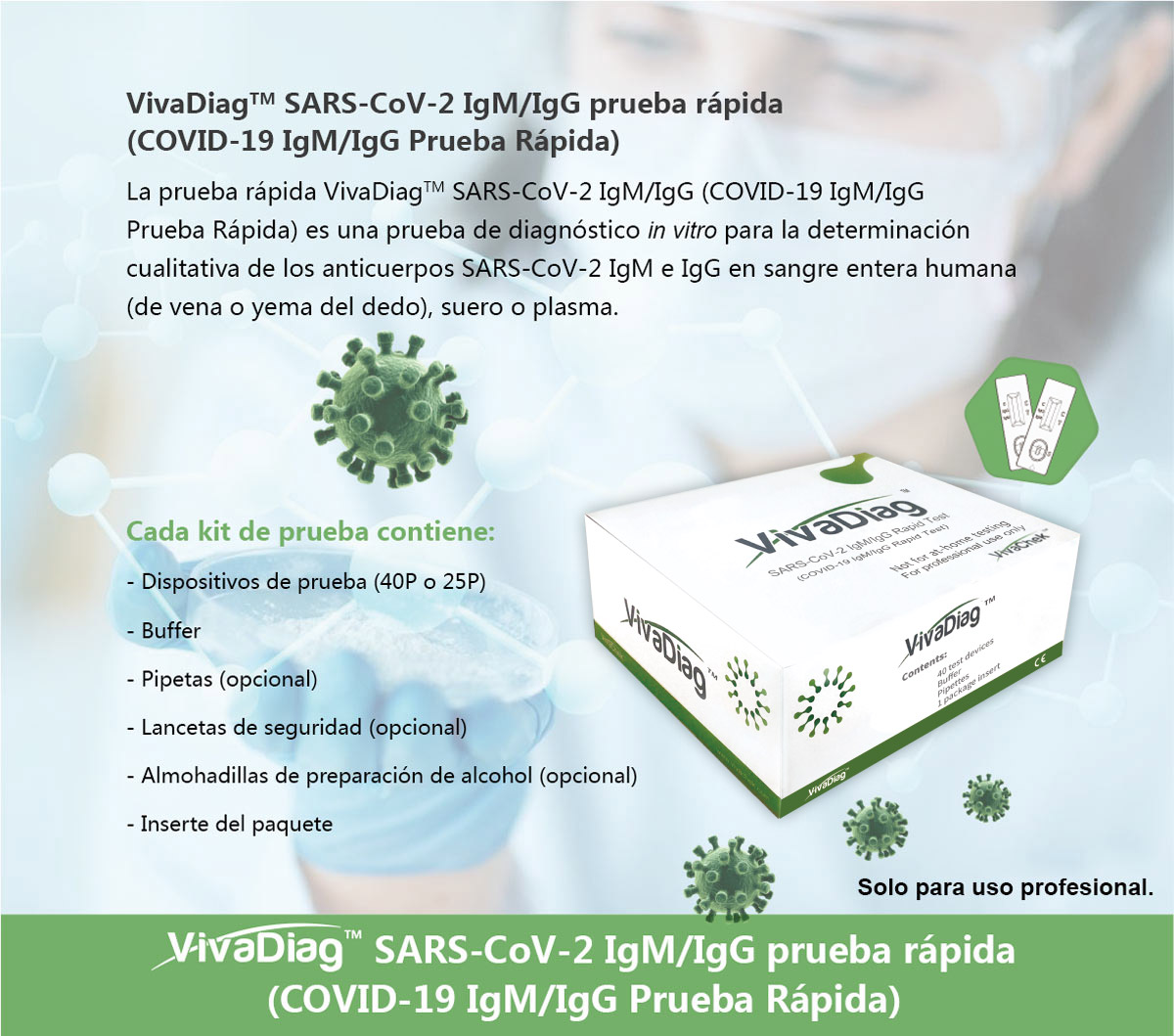 La prueba rápida VivaDiag™ SARS-CoV-2 IgM/IgG prueba rápida (COVID-19 IgM/IgG Prueba Rápida) está destinada para uso exclusivo de profesionales de la salud y laboratorios clínicos. PUEDE PRODUCIR RESULTADOS DE PRUEBA NO VÁLIDOS Y/O NO CONFIABLES.