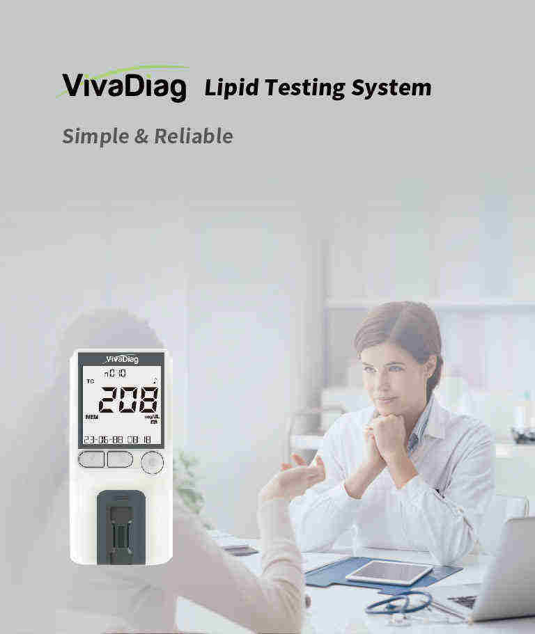 VivaDiag Lipid is a cholesterol meter and measures a variety of items, including TC, TG, HDL, LDL, TC/HDL. Due to its portable size, it can be more easily stored and can be used in various places without electricity; the test strips can be stored easily in a room temperature.