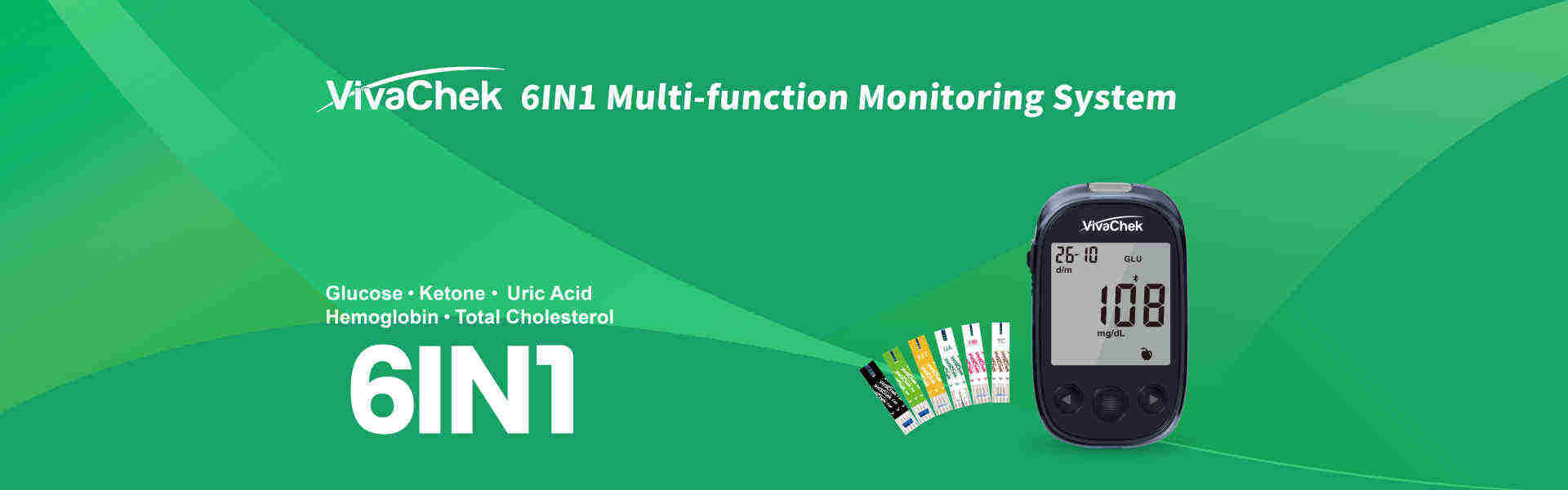 VivaChek 6in1 multi-function monitoring system, designed to simplify your health management. With the ability to test glucose, ketone, hemoglobin, total cholesterol and uric acid levels, the device empowers you to monitor and track your body's vital markers with ease and accuracy. The system utilizes advanced sensor technology, ensuring precise readings and providing valuable insights into your metabolic health. Stay on top of your well-being effortlessly with our six-in-one monitoring system, designed to simplify and enhance your health journey.